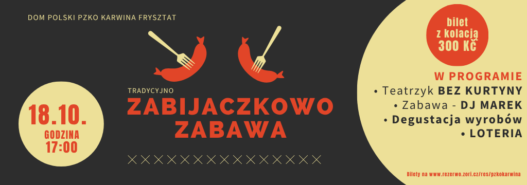 MK PZKO Karwina Frysztat serdecznie zaprasza na „Zabijaczkowóm zabawe”, która odbędzie się w sobotę 18 października 2025 od godziny 17:00 w Domu Polskim w Karwinie-Frysztacie. W celu zakupu biletów potrzebna jest wcześniejsza rezerwacja. Prosimy o wybranie wolnych miejsc (krzeseł) i kliknięcie na przycisk "Zamów", który przekieruje Państwo do formularza rezerwacji.